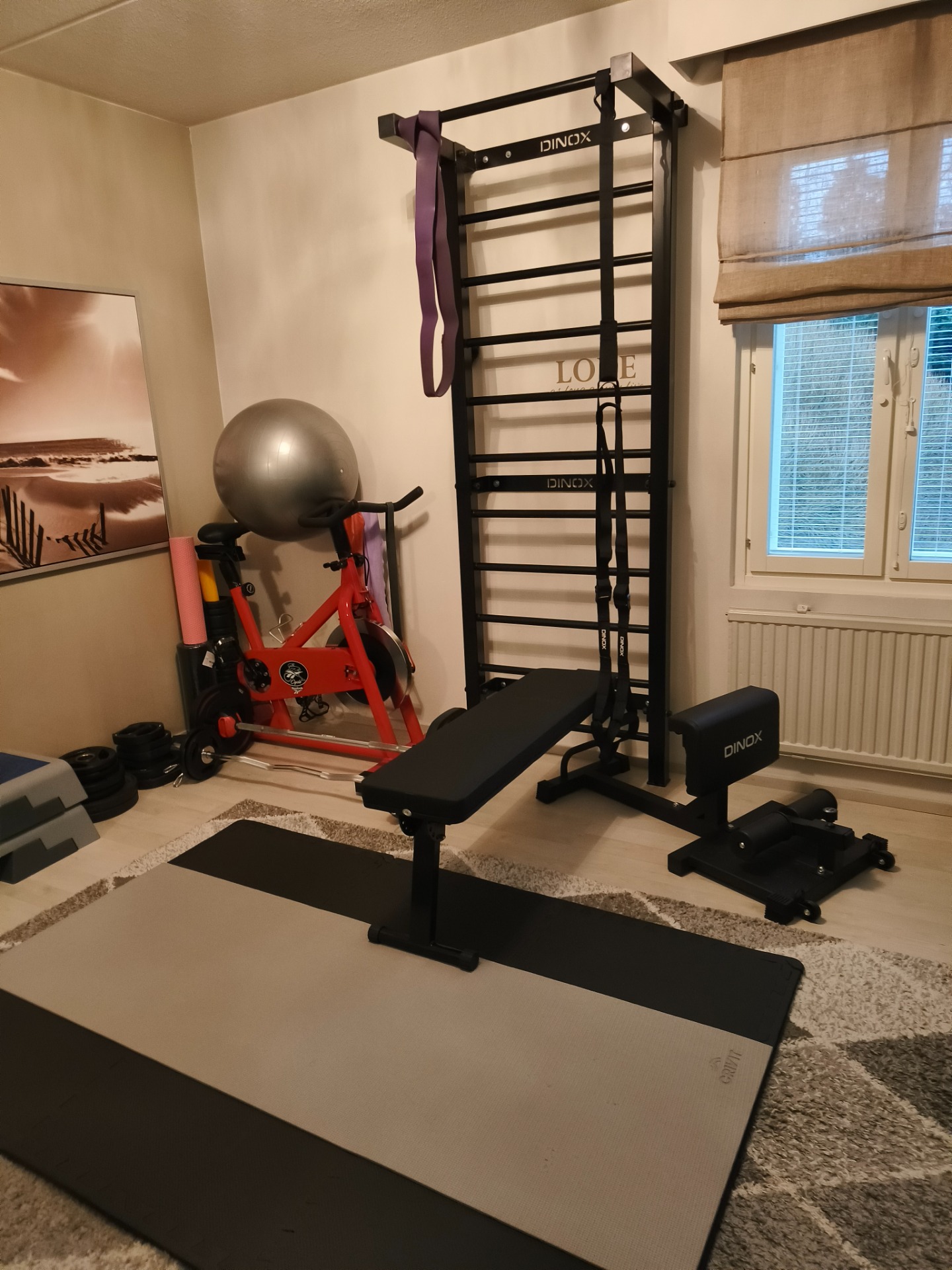 Kaarinassa sijaitsevan PRIVAT kotisalin lisäksi kotonani Turun Katariinanlaaksossa on tila, joka soveltuu toiminnalliseen oman kehon painolla tapahtuvaan treeniin sekä esim. kahvakuula, irtopaino, fitness trampoliini tai ison jumppapallon kanssa tehtävään harjoitteluun. Tila soveltuu myös monipuoliseen kehonhuoltoon ja venyttelyyn.